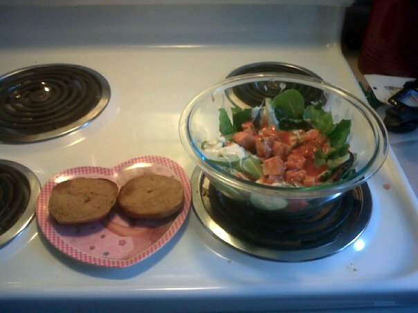 Then the bun I used I Can't Believe It's Not Butter spray and put on garlic salt and garlic powder...I ate one side with my salad and then used the other side to soak up the extra hot sauce/dressing. SO YUMMY.